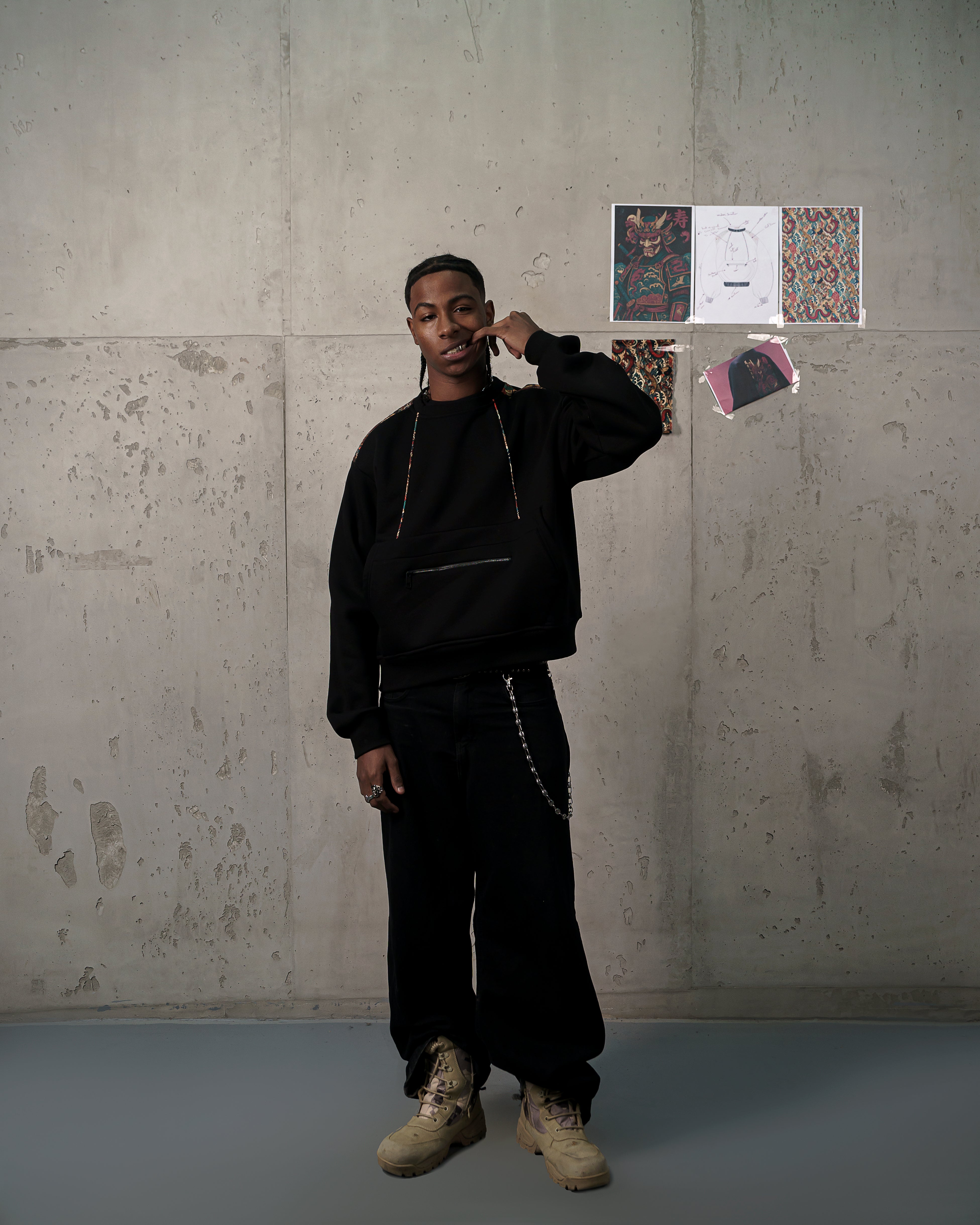 A black sweatshirt featuring Mauristique’s original patterned shoulder patches inspired by nature and Japanese minimal art.
