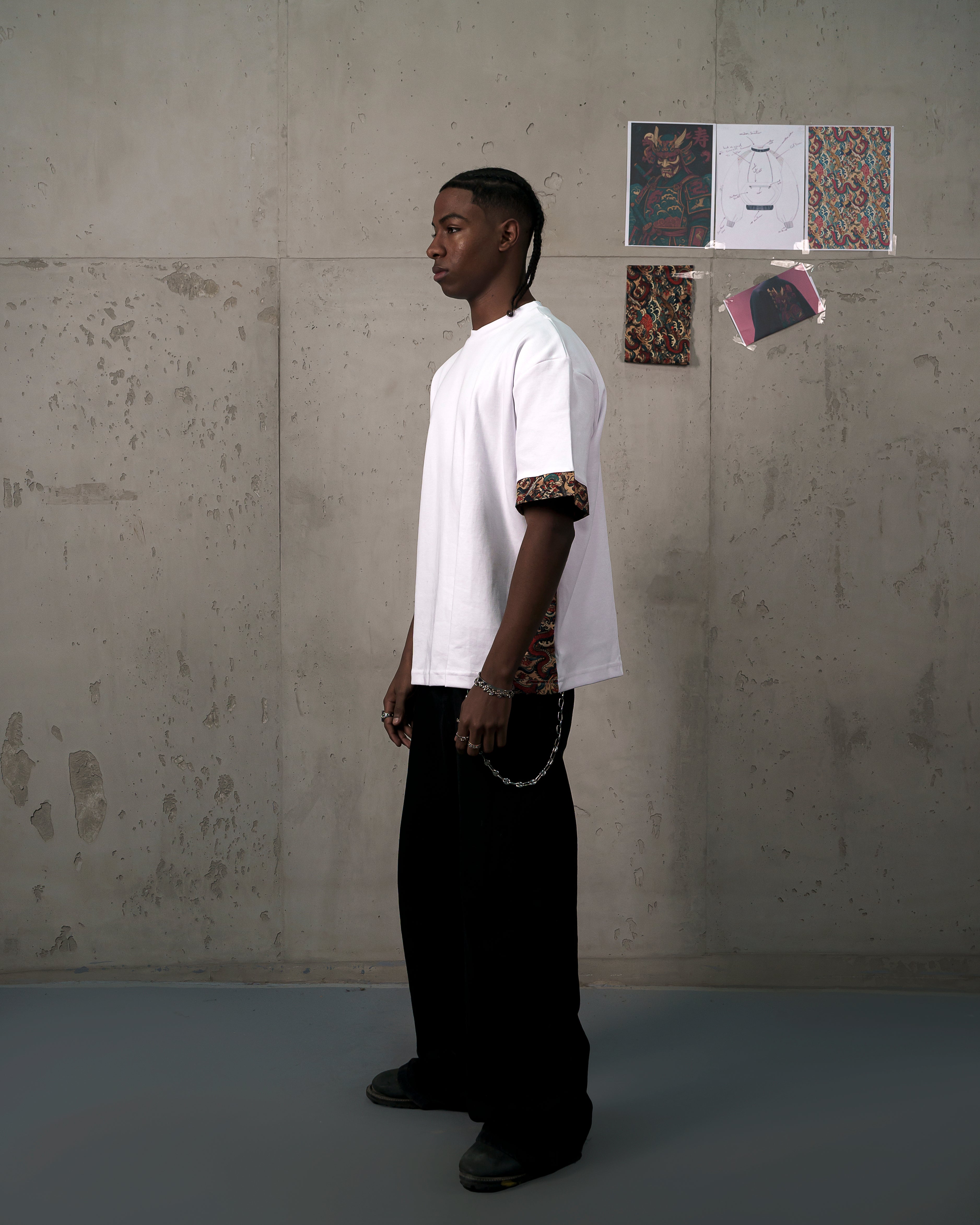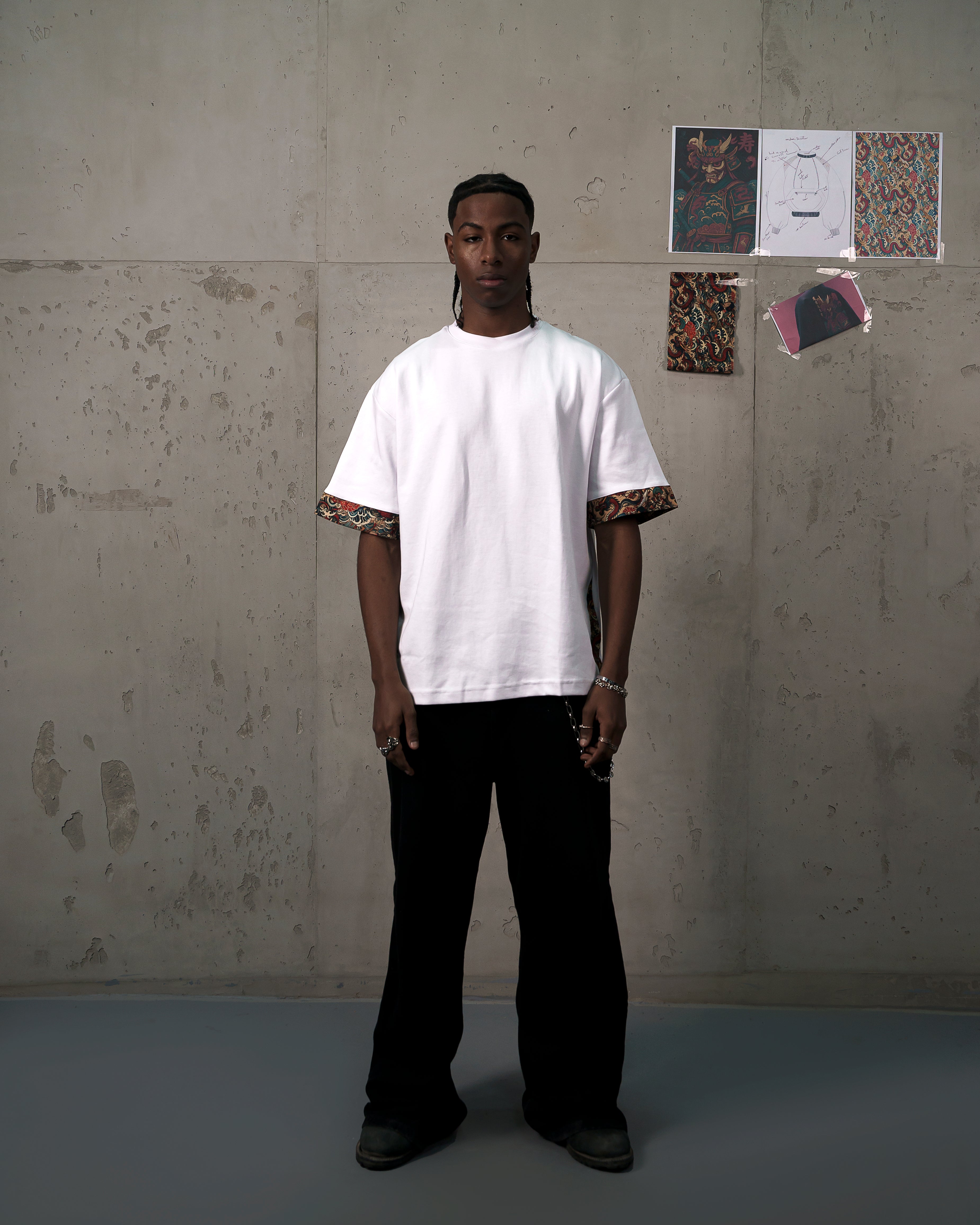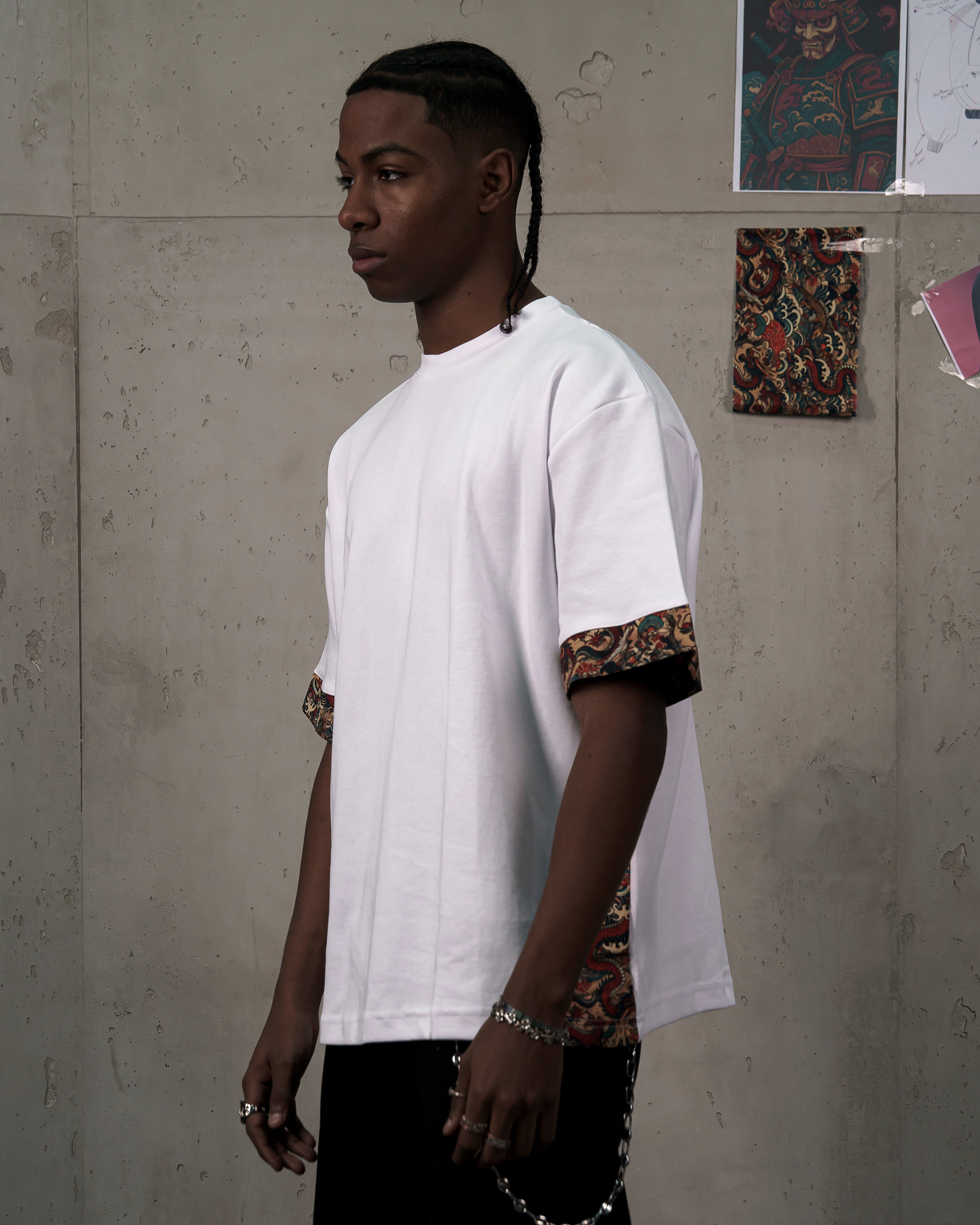 This oversized white tee delivers balance — structured through heavyweight Egyptian cotton and elevated with dragon-pattern trims on sleeves and sides. Inspired by tradition, made for today.