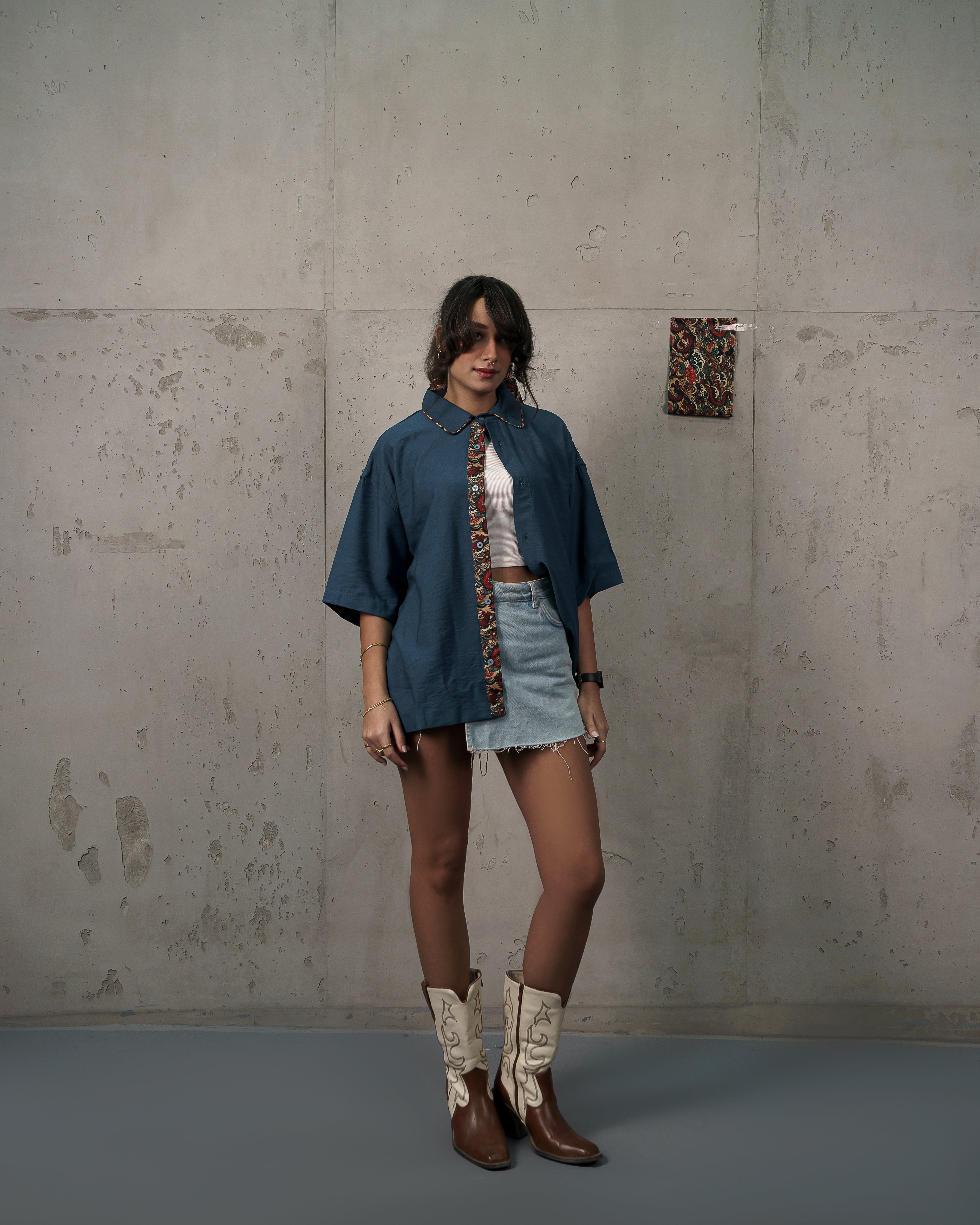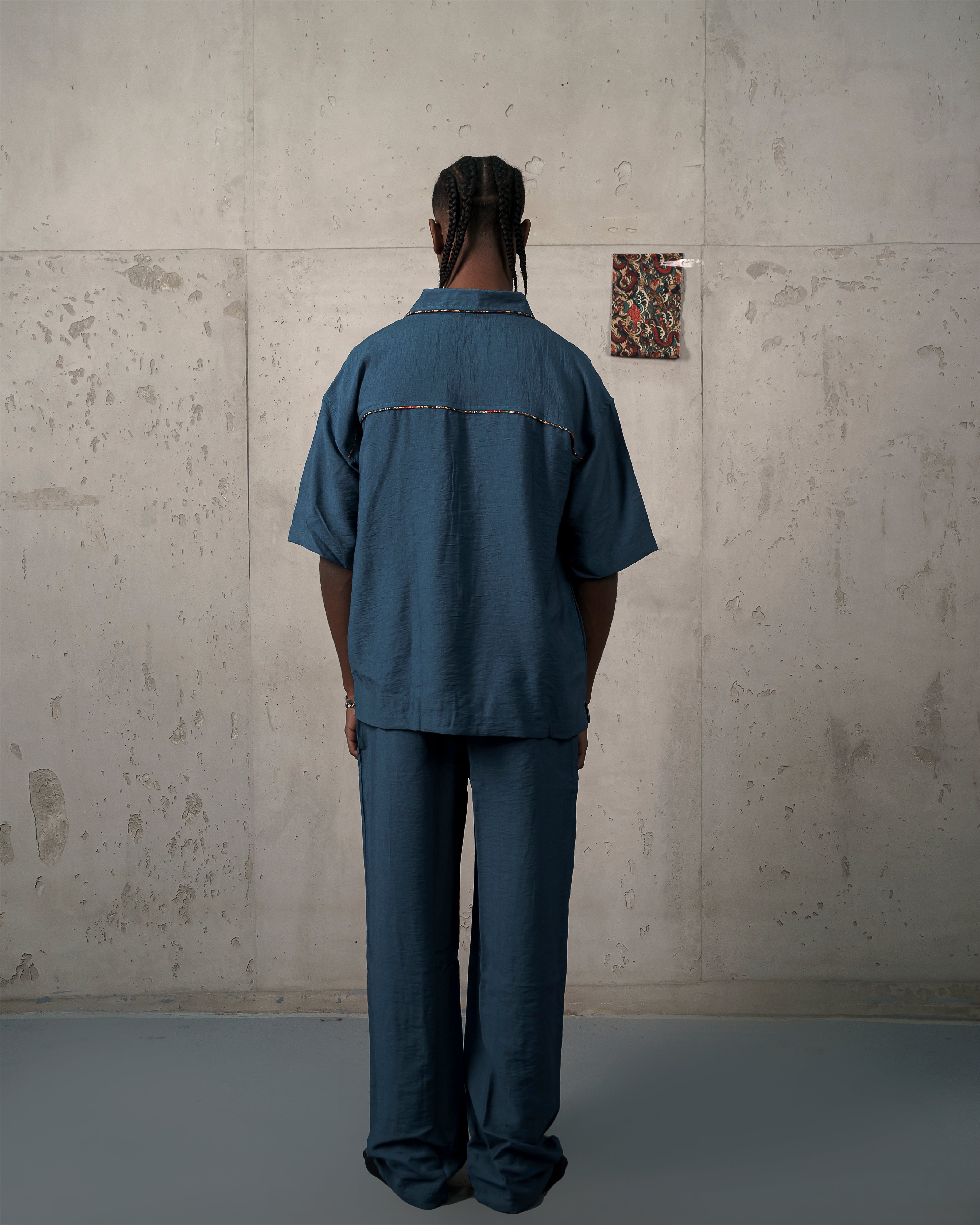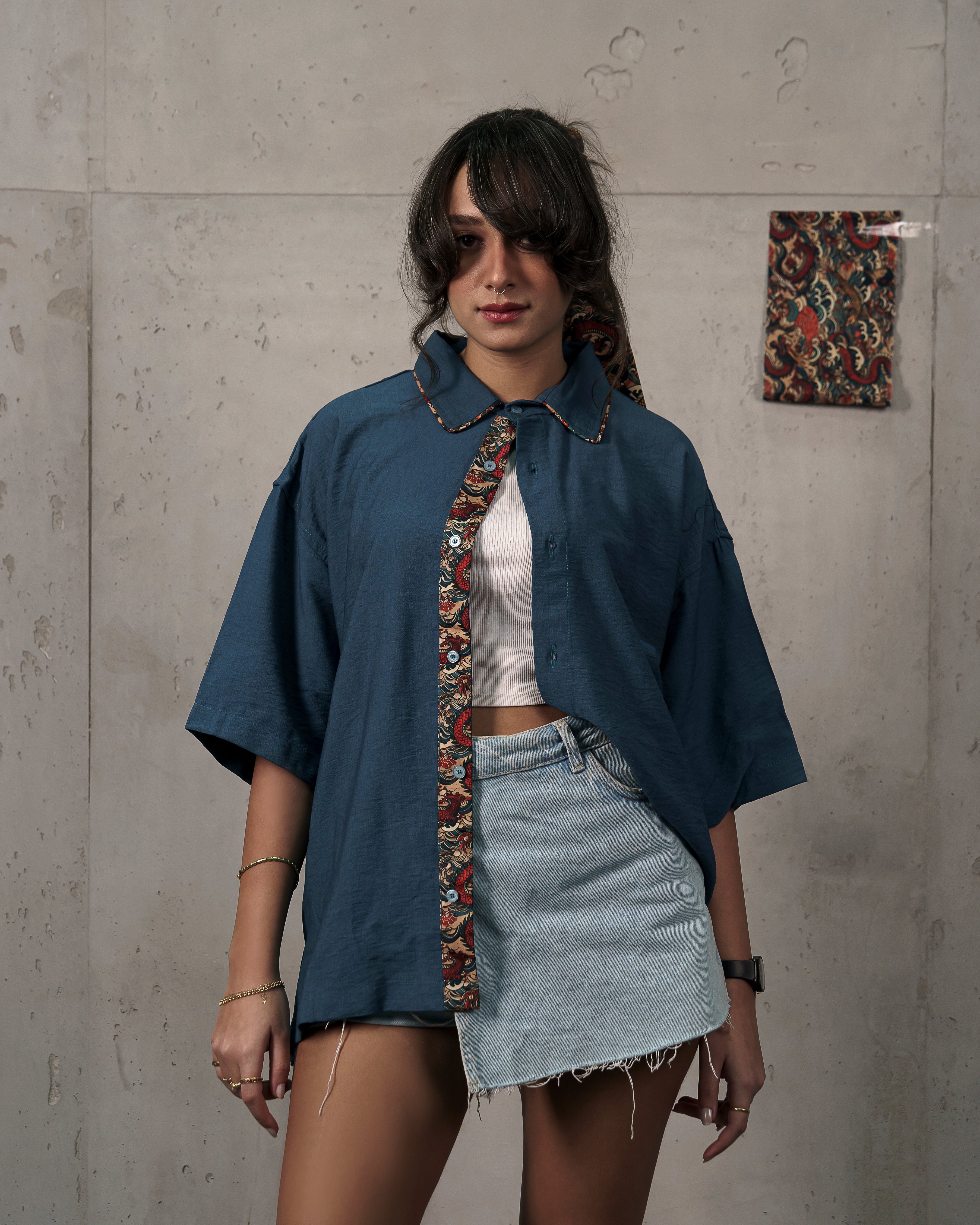 This oversized midnight-blue chemise is crafted from lightweight linen-blend fabric for a breathable, relaxed silhouette. The collar, button line, and back yoke are trimmed with a signature dragon pattern — adding quiet strength and subtle distinction. Unisex, refined, and ready to lead.